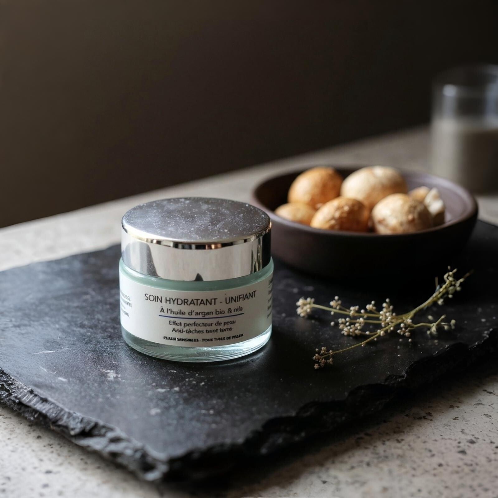 - éclaircissant ( augmente l'éclat du teint et diminue les tâches pigmentaires )
